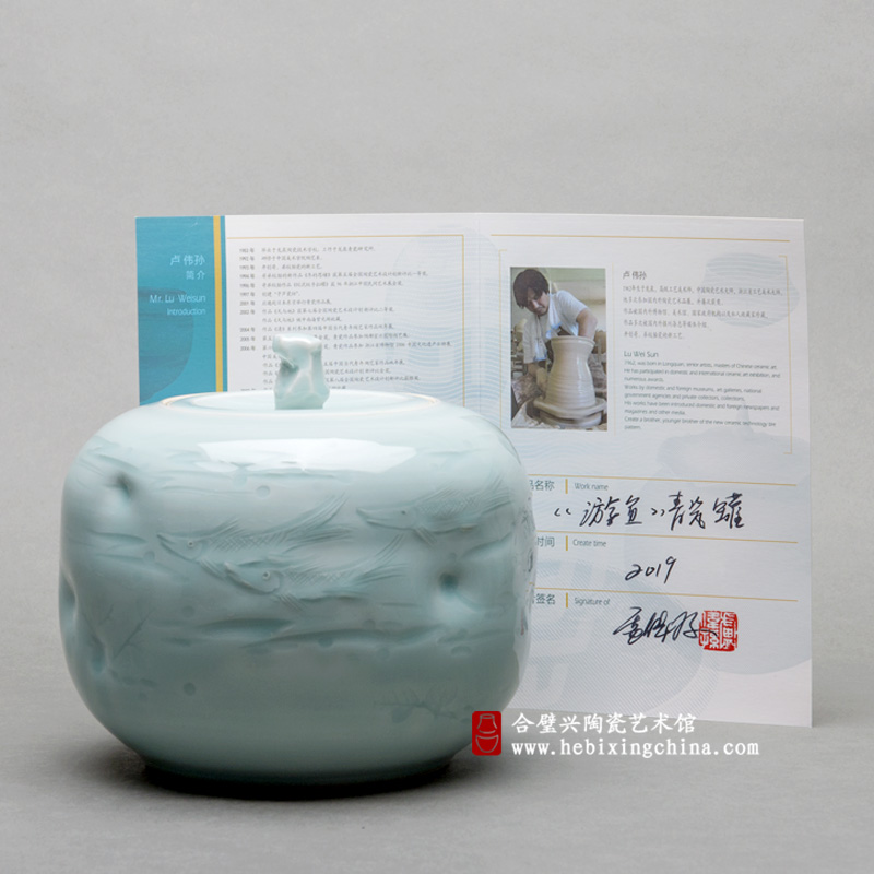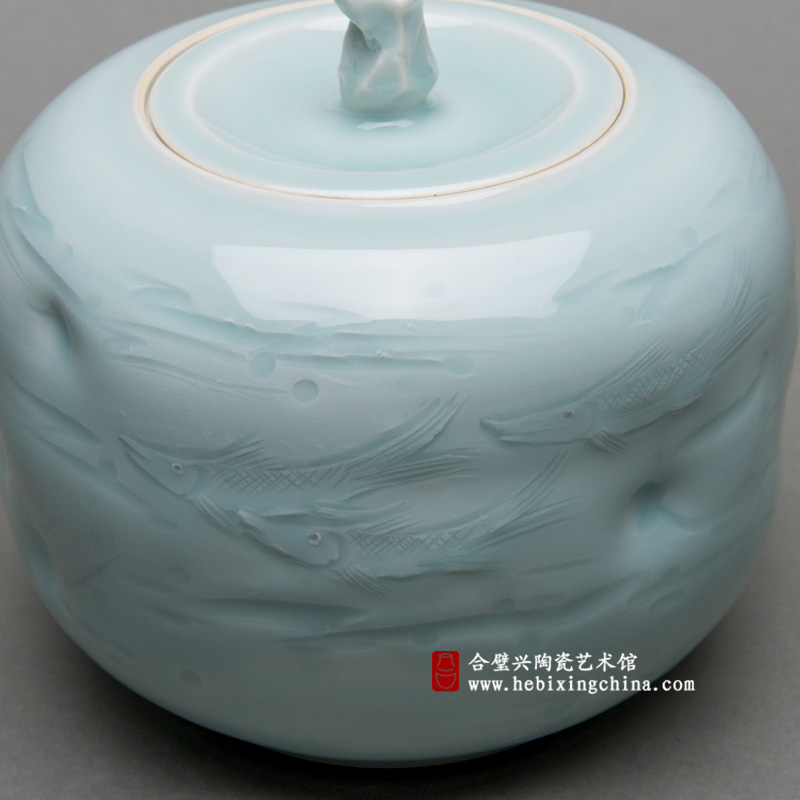 清新的釉色包裹着温柔的轮廓,把盖罐变成了一方静谧的池塘。清新的釉色是阳光下的清澈池水,也是游鱼追逐的美丽浮萍,柔和生动的线条是池塘圆润的形状,也是微风中池水的柔波。
