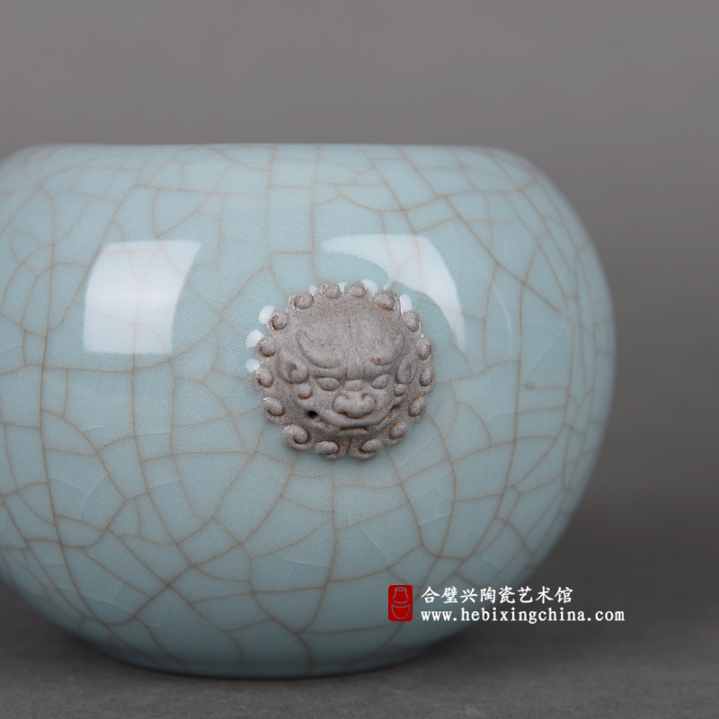 王传斌老师将张扬威武的兽耳简化成精巧的兽扣,狮子造型丰眉环眼,宽鼻阔口威严依旧却没有了传统兽耳的张扬,与青瓷的温雅气质结合的愈发浑然天成。