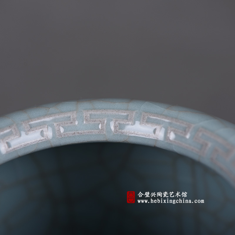 内倾的口唇上装饰着一圈精致的淡灰色回纹,横平竖直的线条随着口唇的弧度发生了微微的变化。