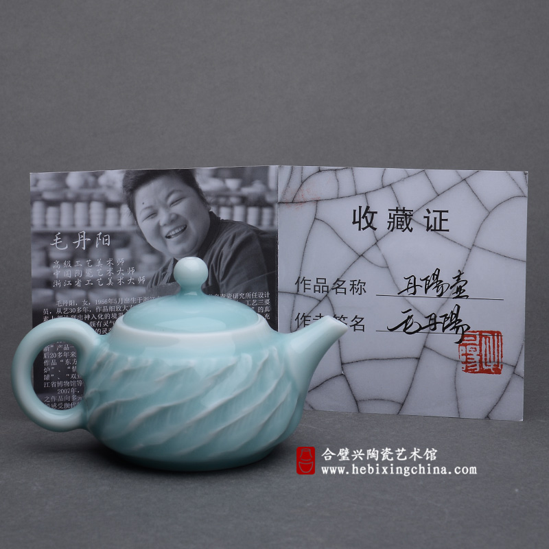 毛丹阳系青瓷名家毛松林大师长女,其作品极富女性内涵韵味,注重细节,构思奇妙,手工细腻,既有传统文人气又富有现代装饰感,个性鲜明,生活气息十足,带给人们艺术和美的享受。毛丹阳把雕塑技巧充分运用到青瓷装饰上,那些含蓄、细腻、富于变化的线条和那些生动鲜活、舒展饱满、刚柔兼备的装饰图案,让这个沉静清雅的青瓷世界多了许多动感。作品多次参加全国工艺美术精品展览并获奖,深受喜爱,被国内外馆藏机构和陶瓷爱好者广为收藏。