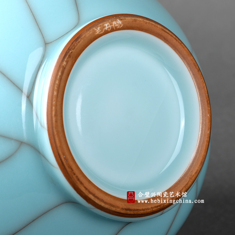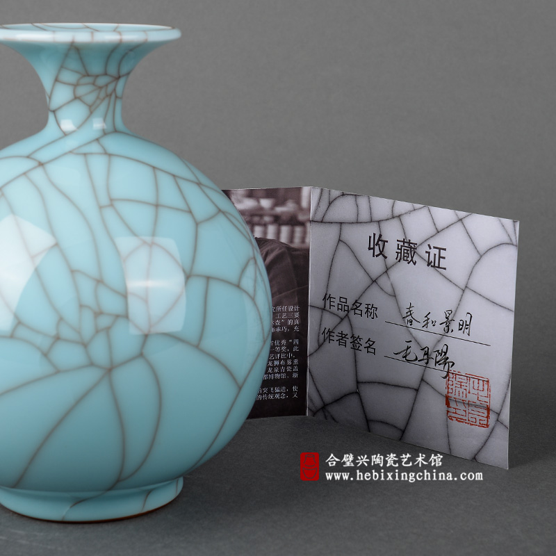赭色的开片纹路似有魔力般,把渐融的冰面,清透的春水,美丽的碧色牡丹都连缀在这圆润的瓷瓶上,共同组成了一片春和景明的好春光。