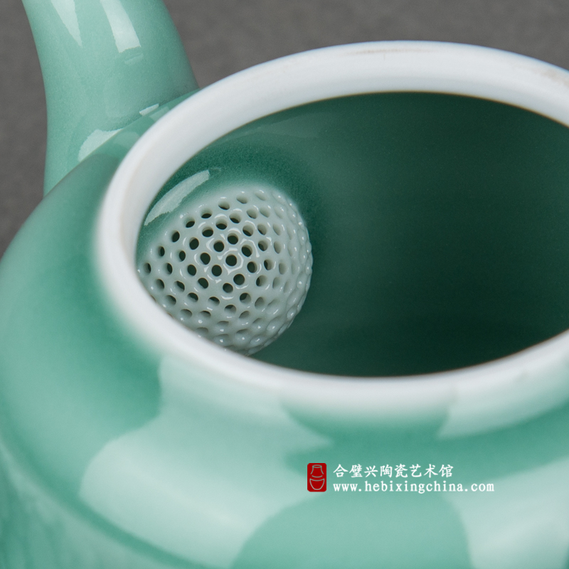 匀称的比例,流畅的线条构成了一把精巧可人的小壶。丰腴而清澈的梅子青釉把小壶装点的如春雨滋润过的翡翠一般清新养眼。