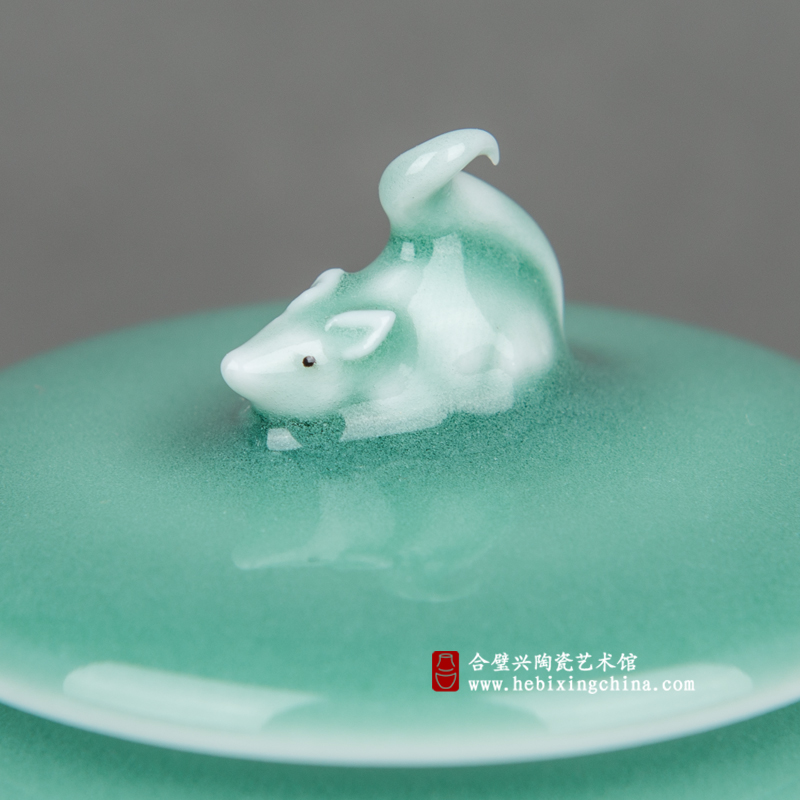 趴在壶盖上的小松鼠此刻正扬着毛绒绒的大尾巴观察着你,两只黑色的小眼睛在晶莹的釉色中显得异常明亮有神。