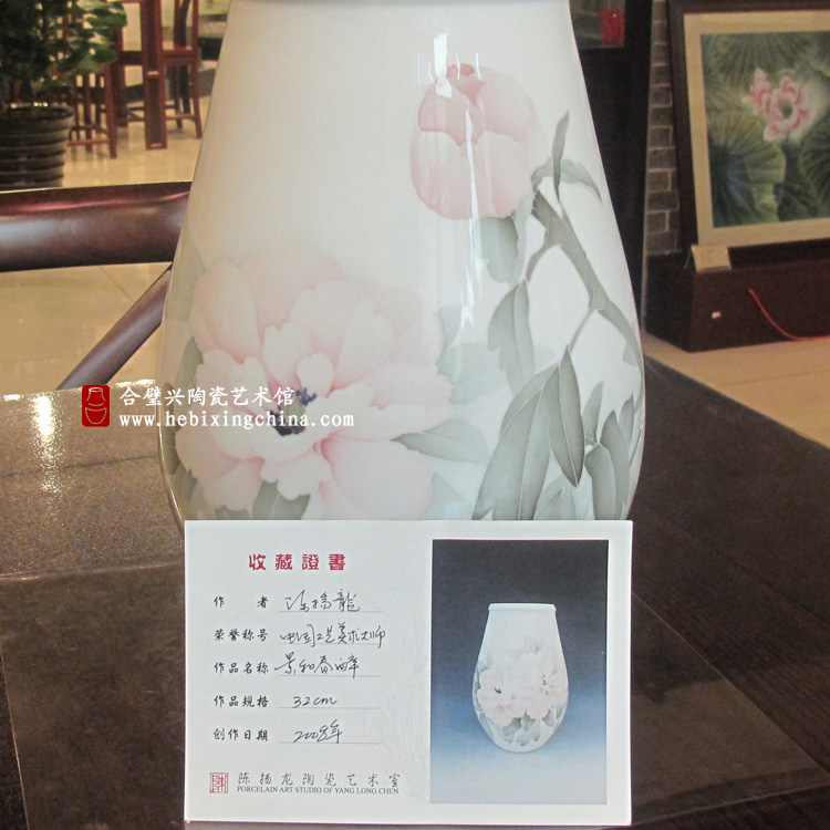 2006年《牡丹杯》、《牡丹笔筒》、《牡丹花插》,56cm《国色天香》瓶,42cm《春色满园》被国务院收藏且陈列